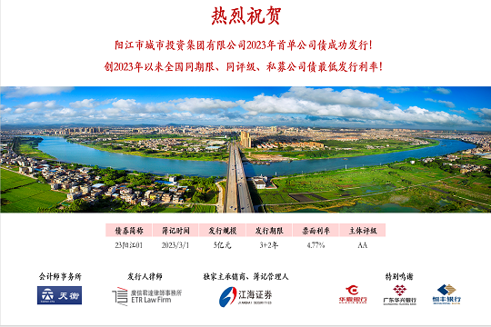 2024年1月19日,市城投集團在深圳證券交易所成功發(fā)行“陽江市城市投資集團有限公司2024年面向專業(yè)投資者非公開發(fā)行公司債券”。本期債券發(fā)行規(guī)模為5.5億元,期限為5(3+2)年,票面利率3.10%,全場認購倍數(shù)超過4.8倍,是...